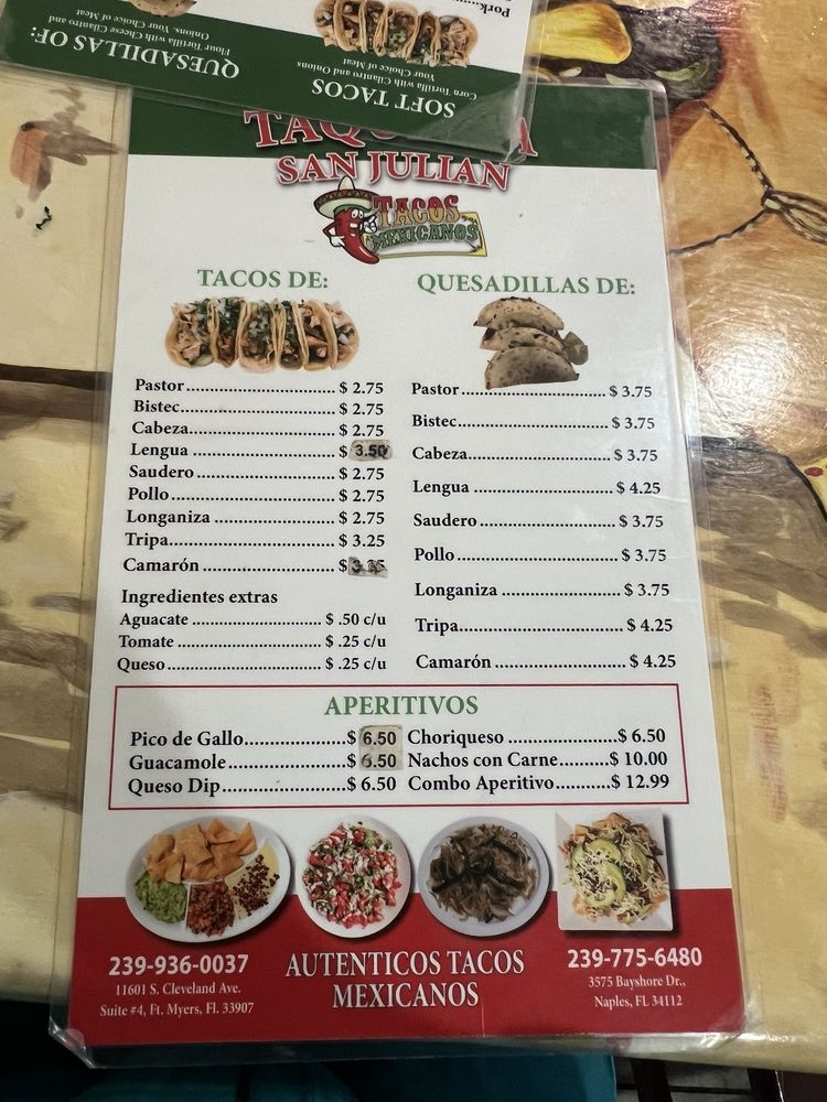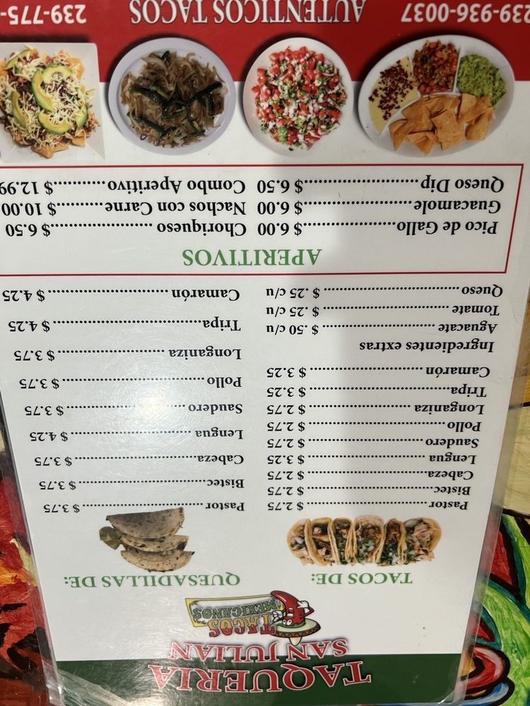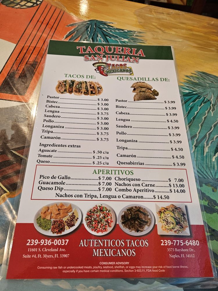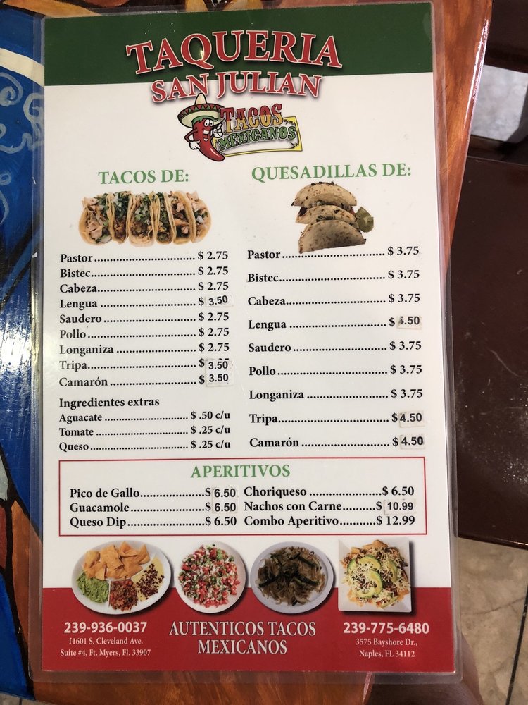 Taqueria San Julian, located in Naples, FL, offers a taste of authentic Mexican cuisine with a diverse menu that includes a variety of soft tacos and quesadillas. Customers rave about the flavorful dishes, with highlights such as the Pastor Soft Taco Pork, Bistec Quesadilla Steak, and delicious Horchata drink. This hidden gem impresses not only with its food but also with its efficient and friendly service. The cozy atmosphere and affordable prices make it a must-visit spot for those craving a taste of Mexico in Florida. Don't miss out on the chance to indulge in some of the best Mexican food Naples has to offer at Taqueria San Julian.